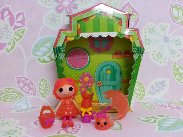 Here are photos of them with the package box they came in. Just like all the other Mini Lalaloopsy Dolls, their box is beautiful and shaped like a dollhouse. Each of the Candy Cute dolls have a handbag, a pet and two other accessories.